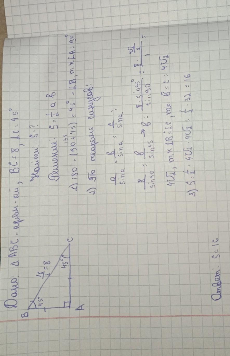3. В прямоугольном треугольнике гипотенуза равна 16/2, а один из ост рых углов равен 45°. Найдите площадь треугольника.