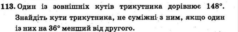 Один із зовнішник кутів трикутника дорівнює 148 Знайдіть кути трикутника не суміжні з ним якщо один із них на 36 менший від другого