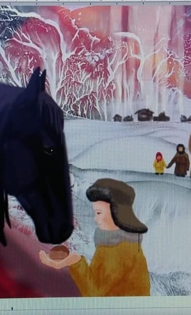 Художник изобразил эпизод рассказа, в котором Филька ищет примирения с конем. Конь тянется к теплому свежему хлебу, но пятится задними ногами, охаживая их хвостом. Конь не доверяет Фильке. А тот и сам испуган, ведь такая беда обрушилась на деревню, по вине маленького обидчика. Мальчишка тянет к коню руки, но боится поднять глаза, щеки его горят от стыда, он во-вот расплачется. А старик-мельник словно подталкивает коня к Фильке и зовет мальчишку взглядом, мол виноват - проси прощения.