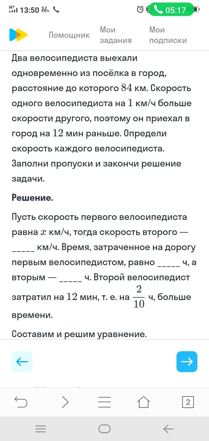 *Заполняю пропуски* скорость второго x-1; время затраченное первым 84/x; вторым 84/x-1.