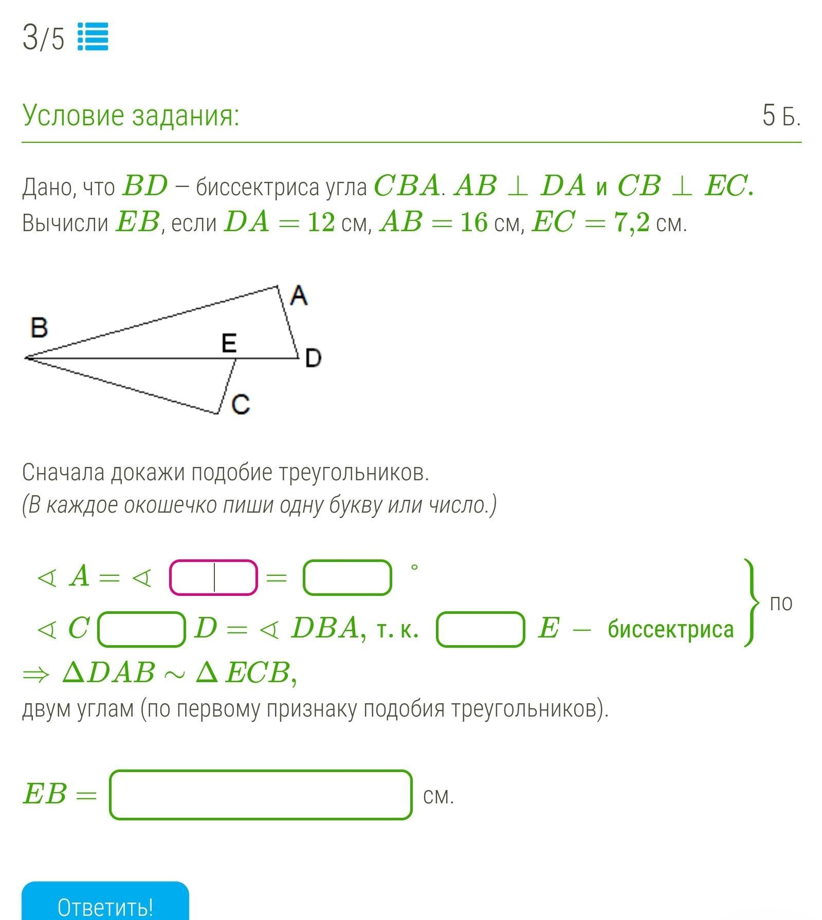 Поскольку треугольники подобны, то и стороны ЕВ и ДВ подобны, то ЕВ/ДВ=ЕС/АД= 7,2/12