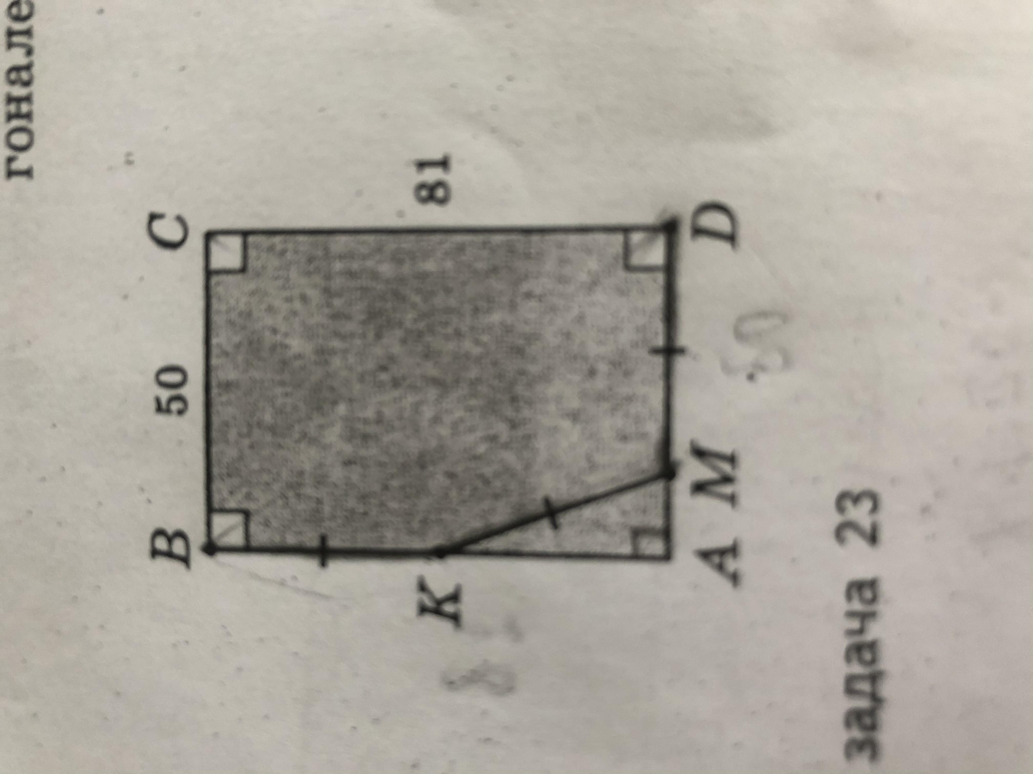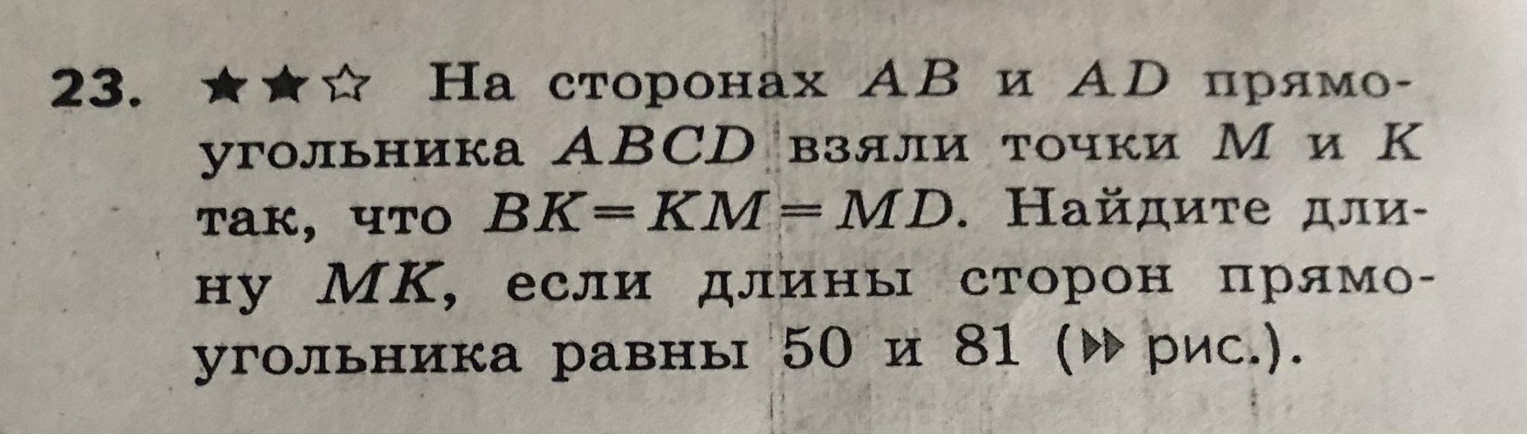 Обозначим BK = KM = MD = x, тогда AK = 81 – x, AM = 50 – x. Треугольник KAM является прямоугольным, поэтому по теореме Пифагора: