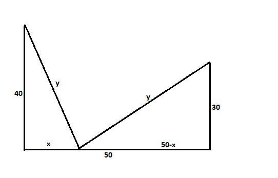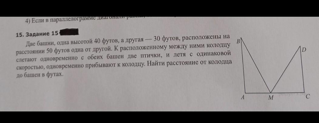 Две башни высотой 40 футов , а другая — 30 футов , расположены на расстоянии 50 футов одна от другой . К расположенному между ними колодцу слетают одновременно с обеих башен две птички , с одинаковой скоростью одновременно прибывают к колодцу . Найти расстояние от колодца до башен в футах