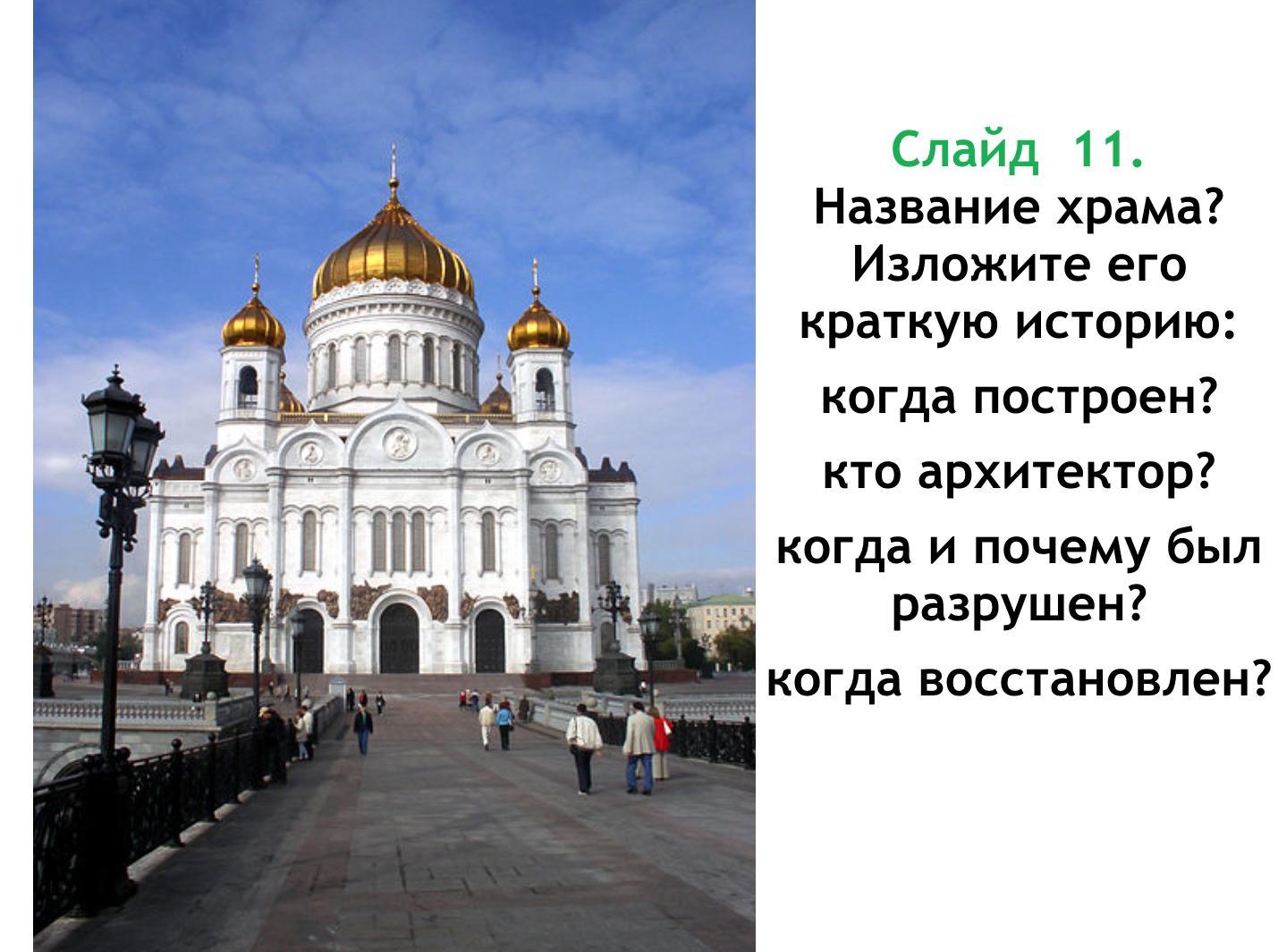 Храм Христа Спасителя, построен в Москве в 1812 г, архитектором был Константин Андреевич Тон. В декабре месяце 1931 года его сносят для освобождения площадки под строительство на этом месте Дворца Советов. Восстановлен 19 августа 2000 г.