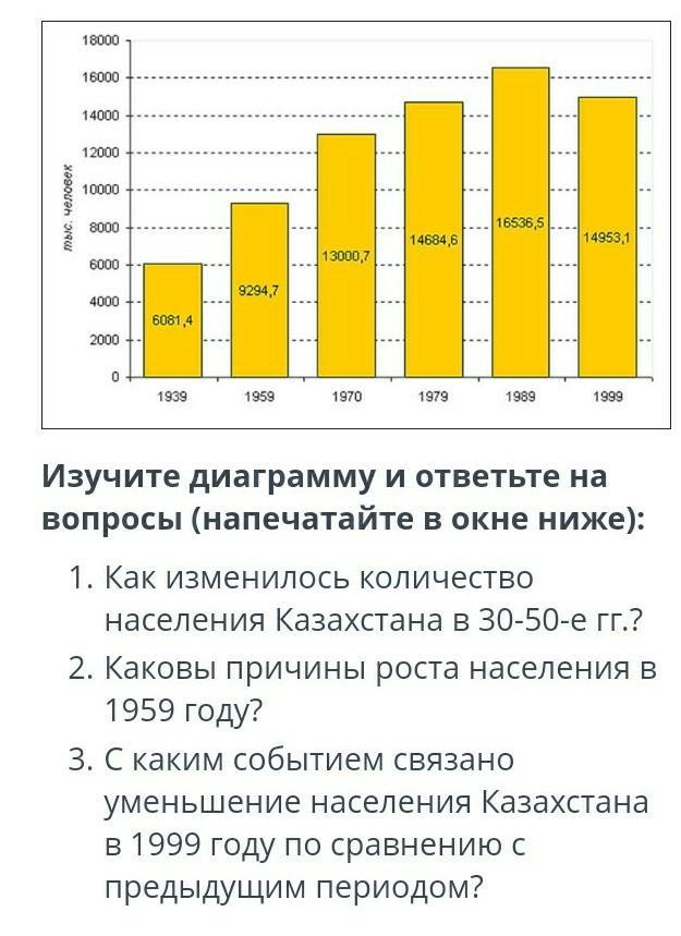 Изучите диаграмму и ответьте на вопросы (напечатайте в окне ниже): 1. Как изменилось количество населения Казахстана в 30-50-е гг.? 2. Каковы причины роста населения в 1959 году? 3. С каким событием связано уменьшение населения Казахстана в 1999 году по сравнению с предыдущим периодом? Пожалуйста дайте правильный ответ не берите ответа других пожалуйста свои правильный ответ