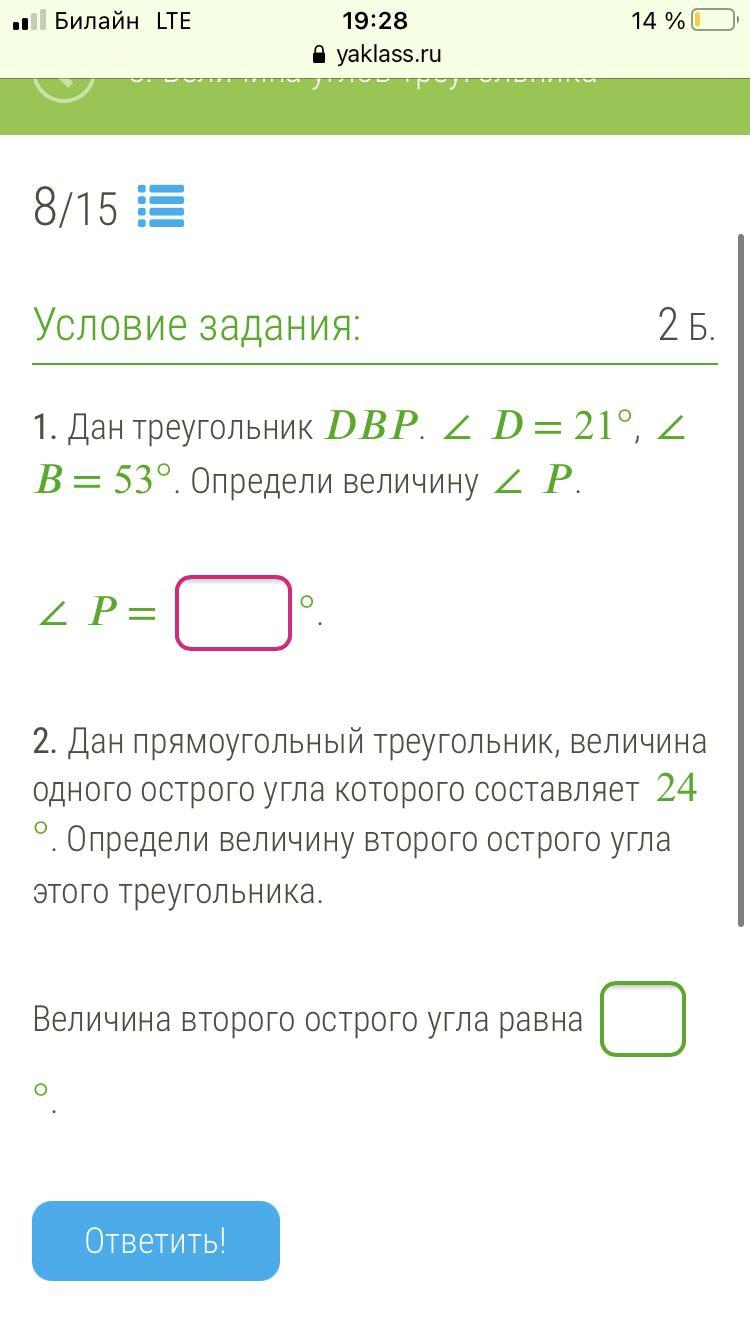 сумму двух острых углов в прямоугольном треугольнике всегда равна 90°, значит
