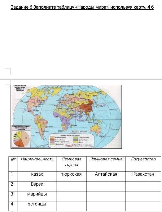 Задание 6 Заполните таблицу «Народы мира», используя карту. 4 б