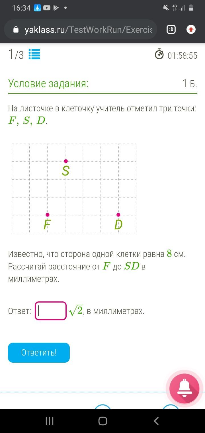 Известно, что сторона одной клетки равна 8 см. Рассчитай расстояние от F до SD в миллиметрах.