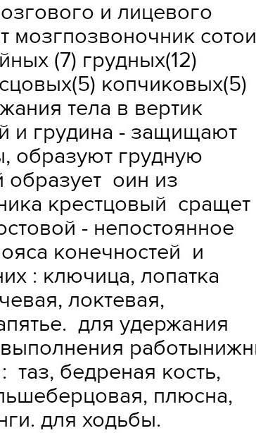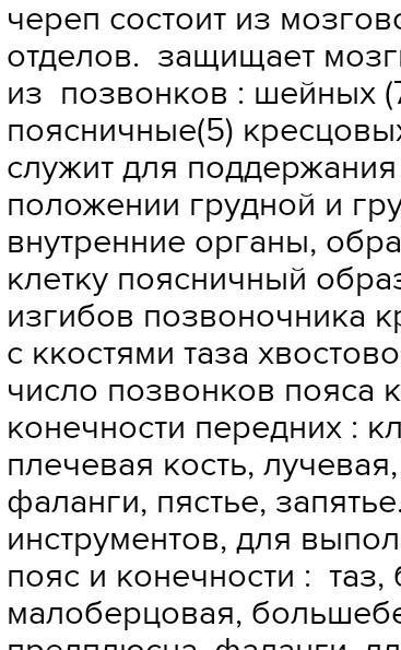Череп состоит из мозгового отдела (внутри-мозг) и лицевого отдела. Передние конечности состоят из плеча, предплечья кисти. Пояс передних конечностей состоит из плоских лопаток и ключицы. На задних конечностях различное кол-во пальцев, у некоторых-ласты.Пояс задних конечностей состоит из бедра, голени и стопы