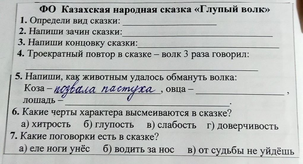 5. коза- позвала пастуха, овца- убежала танцем, лошадь- ударила копытом