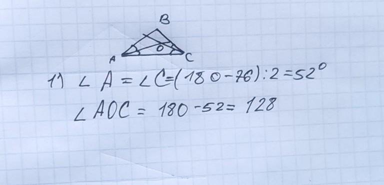 Произвольный треугольник имеет два равных угла. Третий угол в этом треугольнике равен 76°. Из равных углов проведены биссектрисы. Найди больший угол, который образовывается при пересечении этих биссектрис.
