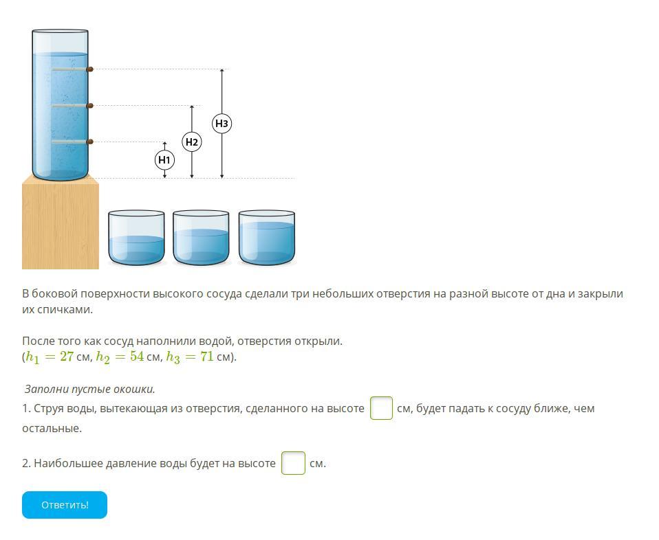 самое большое давление в высоте 71см так как в формуле(p=ρgh) все прямопропорционально а значит с увелечением высоты увеличивается давление.