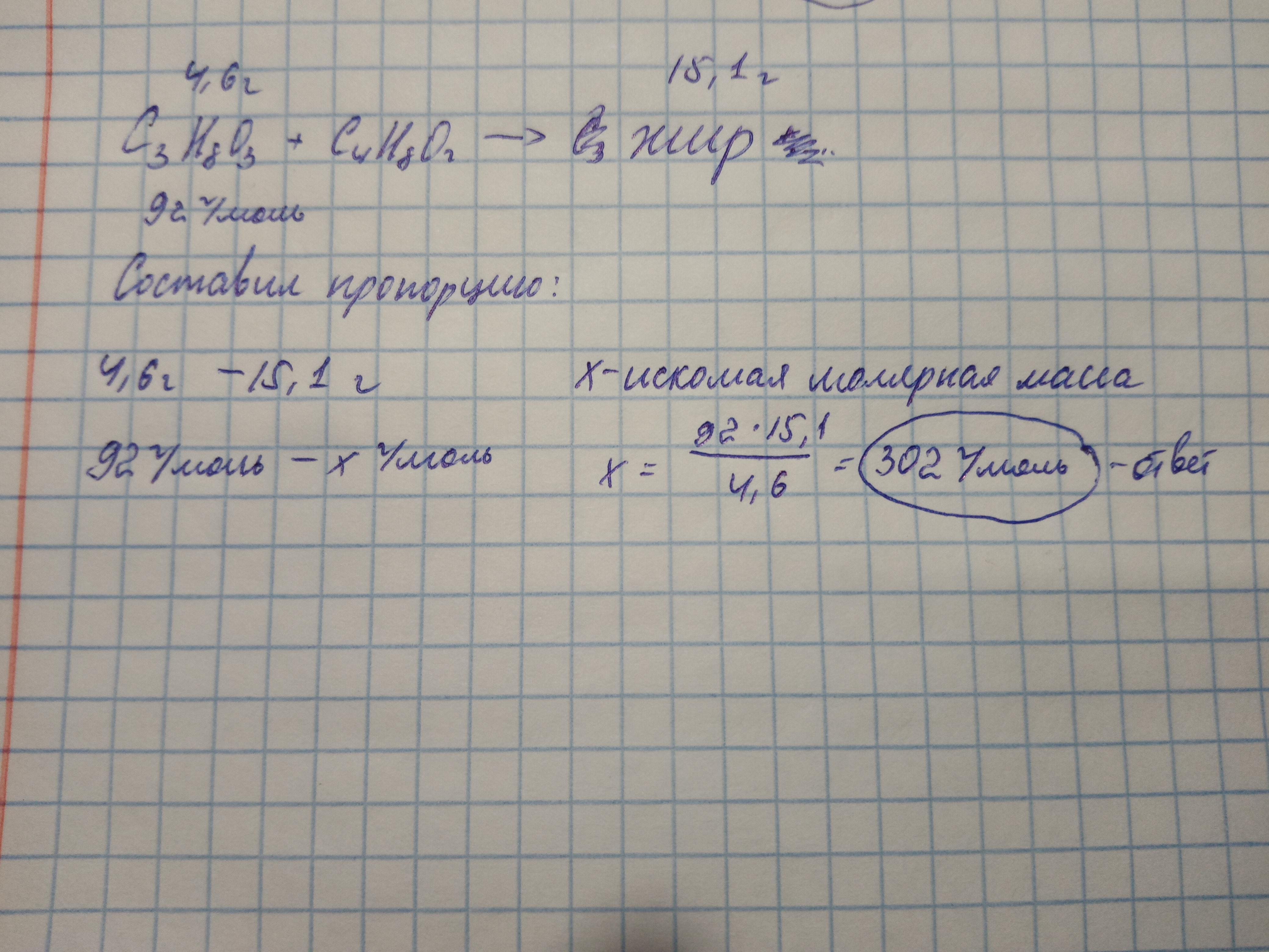 А теперь смотри, как я нашёл молярную массу жира, имея молярную массу глицерина, его массу и массу жира : на втором фото