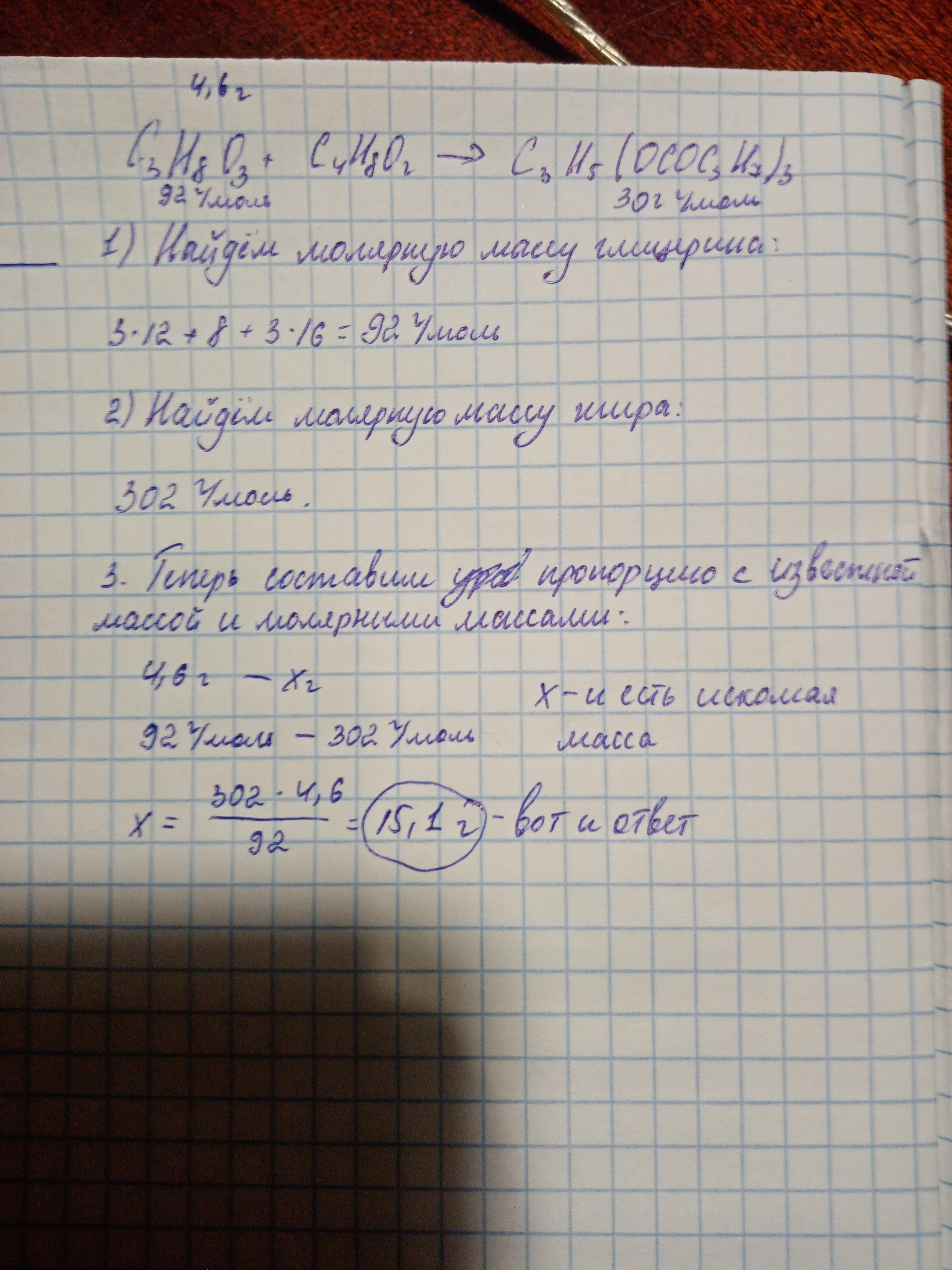 сколько грамм жира трибутирата образуется при взаимодействии 4,6 г глицерина с масляной кислотой? ПОЖАЛУЙСТА ДАЙТЕ ПОЛНОЕ РАЗВЕРНУТОЕ РЕШЕНИЕ! (я знаю, что ответ 15,1)