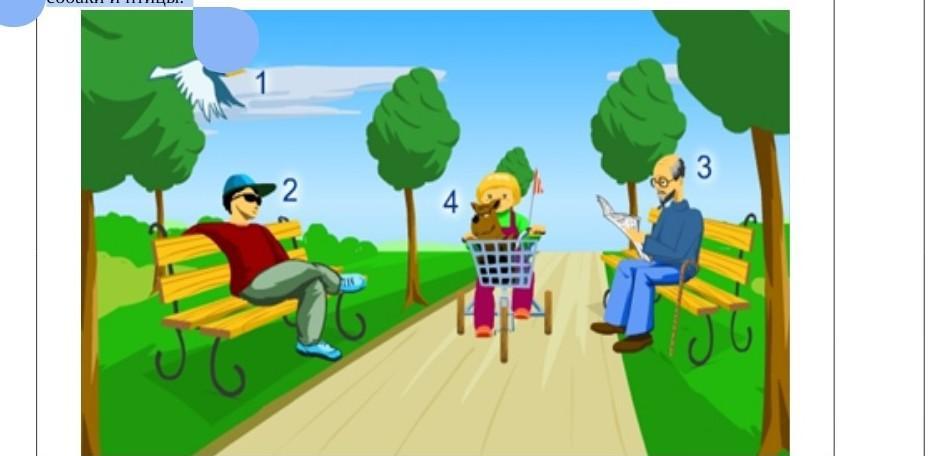 1.Задание. Кто и что на рисунке остается неподвижным по отношению к юноше, сидящему на скамейке? Ответьте на тот же вопрос относительно ребенка на велосипеде, собаки и птицы.