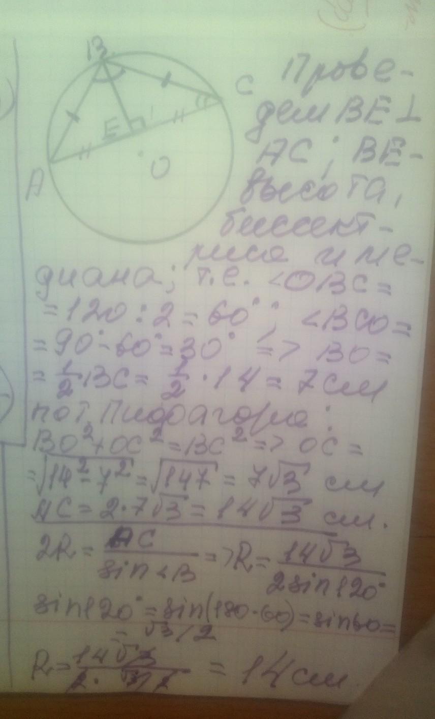 Угол, противолежащей основанию АС равнобедренного треугольника АВС,равен 120 градусов , боковая сторона ВС равна 14 см. Чему равен радиус окружности описанной около этого треугольника.