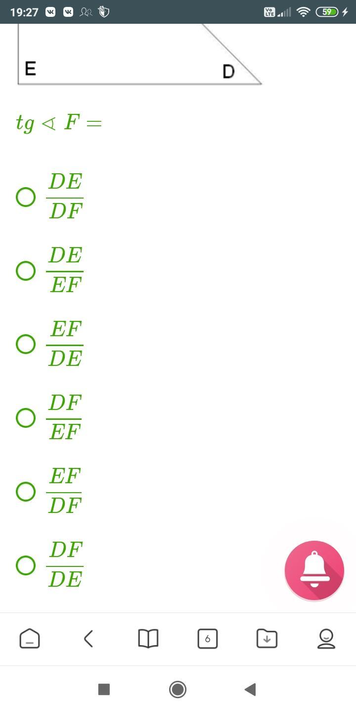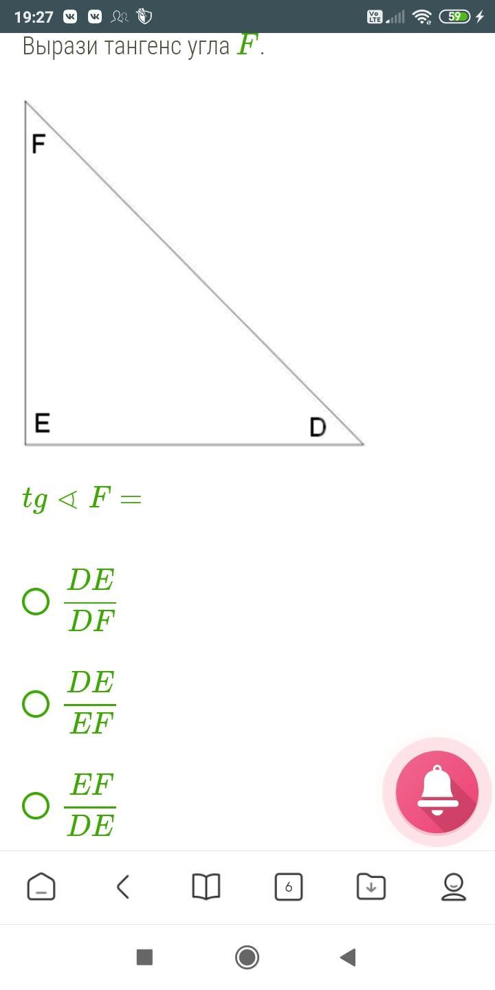 Тангенс - это отношение противолежащего катета к прилежащему. То есть в этом случае противолежащий катет угла F - это DE. Прилежащий - EF.