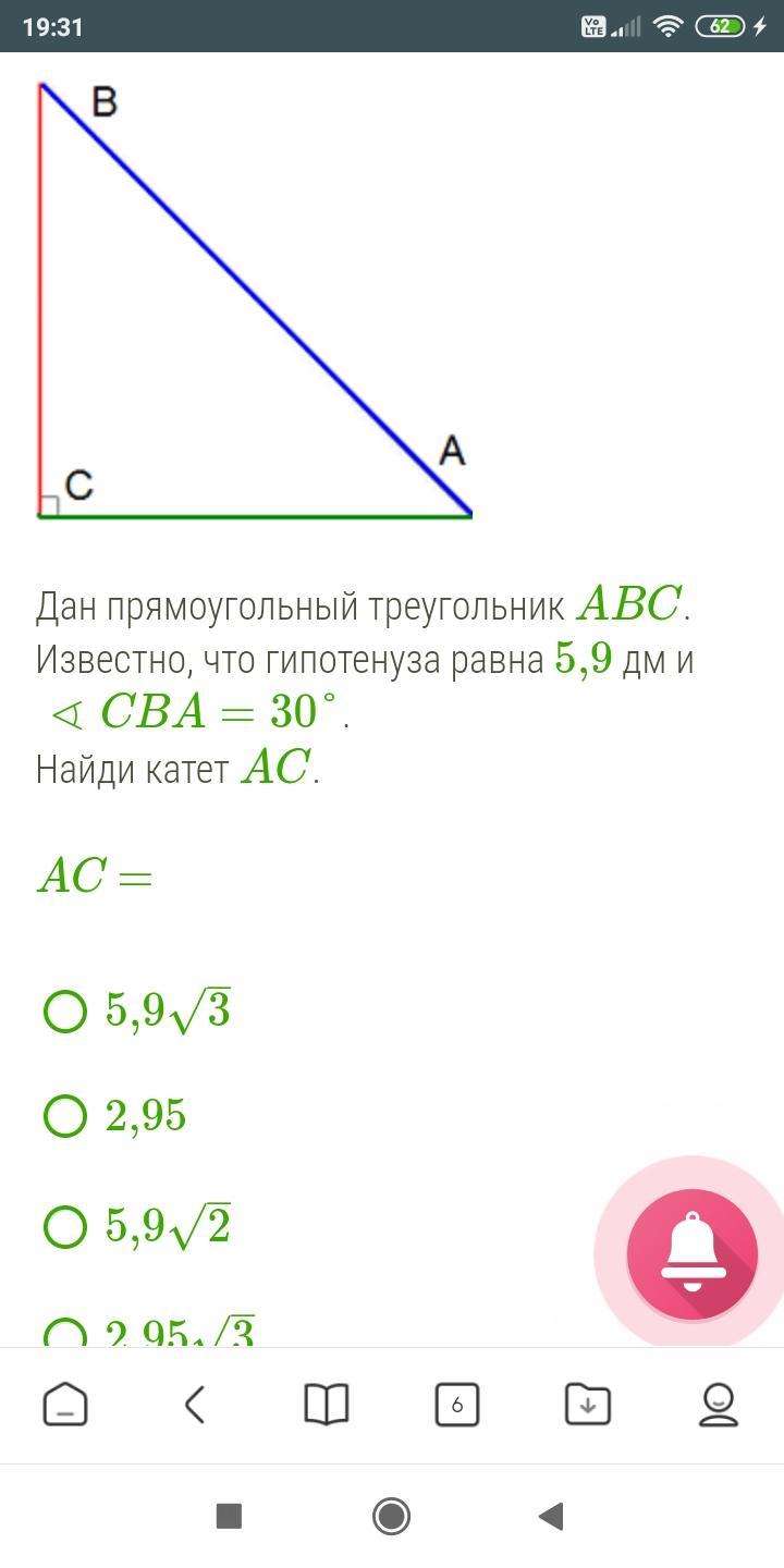 сторона, лежащая против угла 30С, равна половине гипотенузы