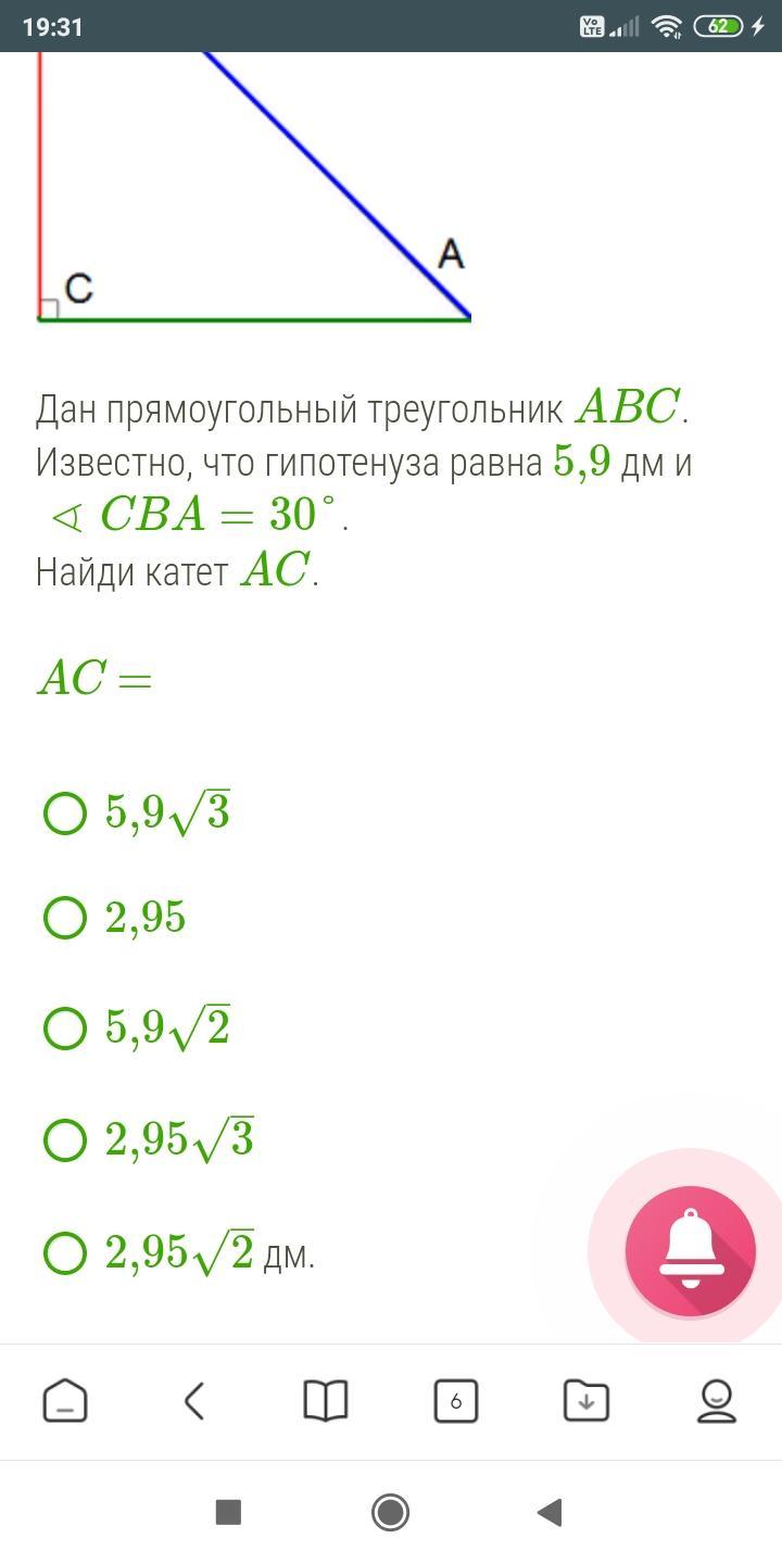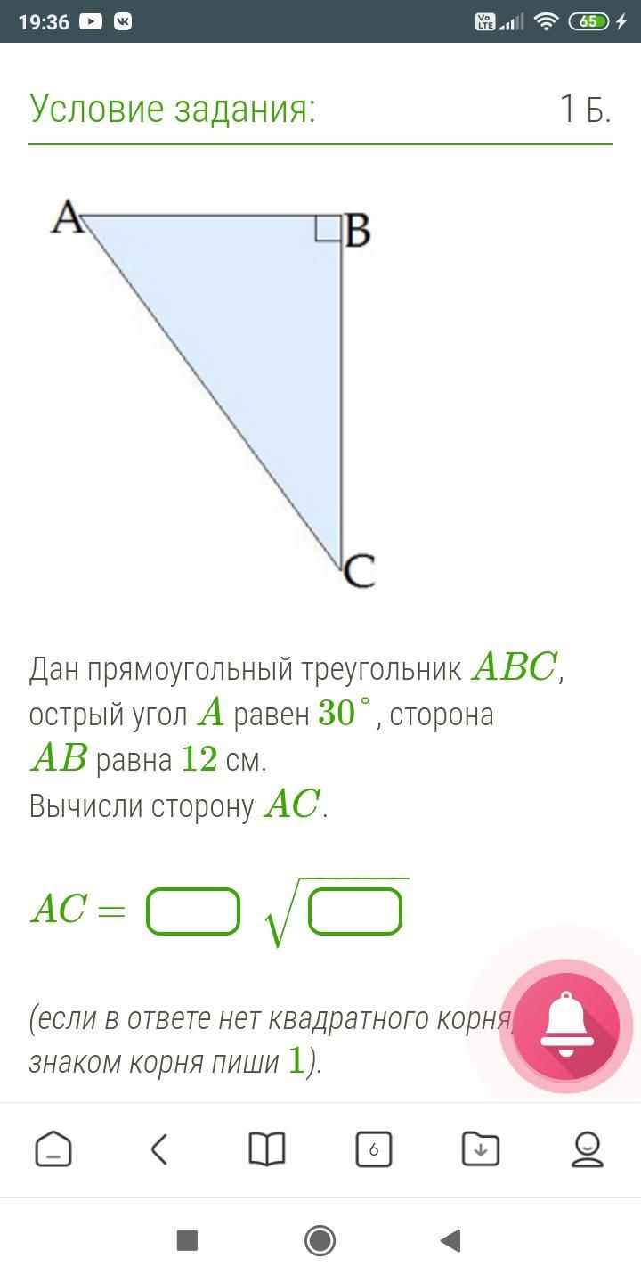 катет, лежащий напротив угла 30 градусов равен половине гипотенузы