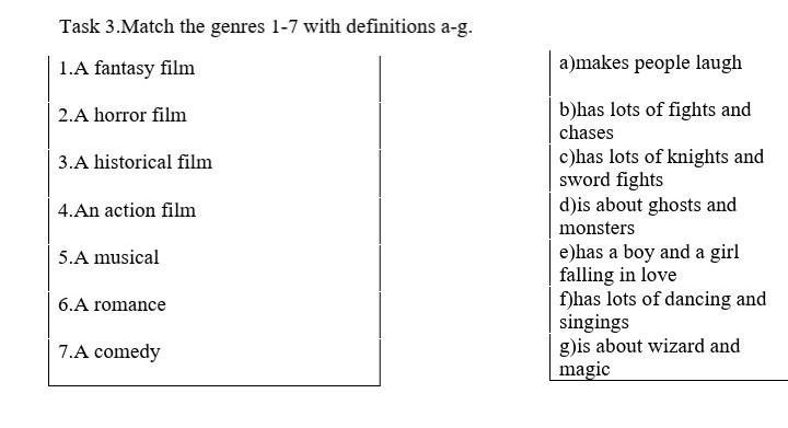Task 3.Match the genres 1-7 with definitions a-g. 1.A fantasy film 2.A horror film 3.A historical film 4.An action film 5.A musical 6.A romance 7.A comedy