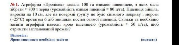 Л 1. Агрофирма «Подснежник» посеяла 100 га озимой пшеницей, из которых имела собрать 800 т зерна (урожайность этим пшеницы 80 ц/га). Пшеница сошла , выросла на 10 см, но на поверхности почвы не было снежного покрова и морозы (25 ° C) в течение 6 суток уничтожили посевы озимой пшеницы. Сколько ( га) необходимо засеять Агрофирме весной яровой пшеницей (урожайность 50 ц / га), чтобы получить запланированный урожай?