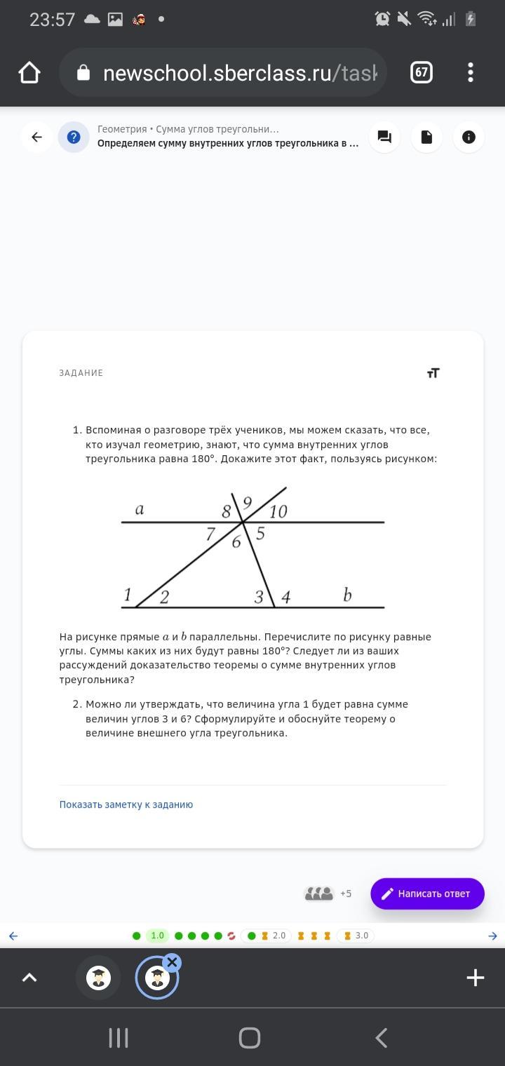 3) Из приведённых рассуждений о равенстве углов следует доказательство теоремы о сумме внутренних углов треугольника.