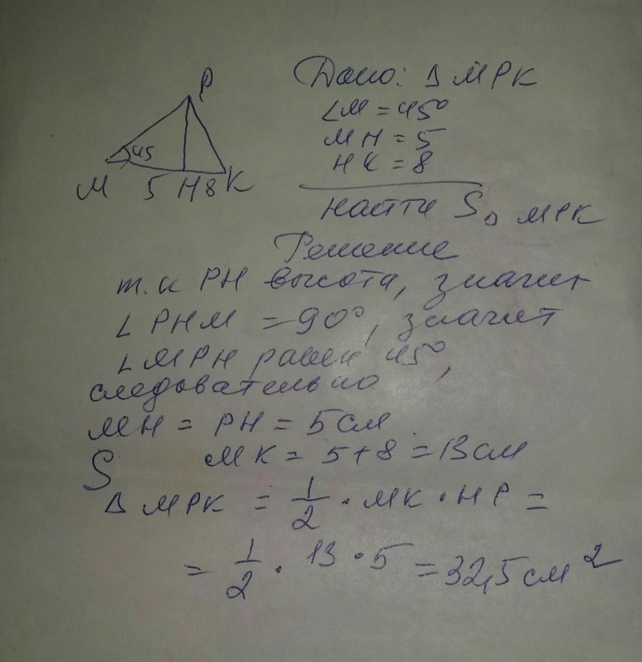 В треугольнике МРК, ∠M=45° , а высота РН делит сторону МК на отрезки МН и НК соответственно равные 5 см и 8 см. Найдите площадь треугольника МРК . поооооооооожжжжжжжжжжжаааааааааааааалллллллллллллууууууууууййййййййййссссссссссссттттттттттааааааааа.