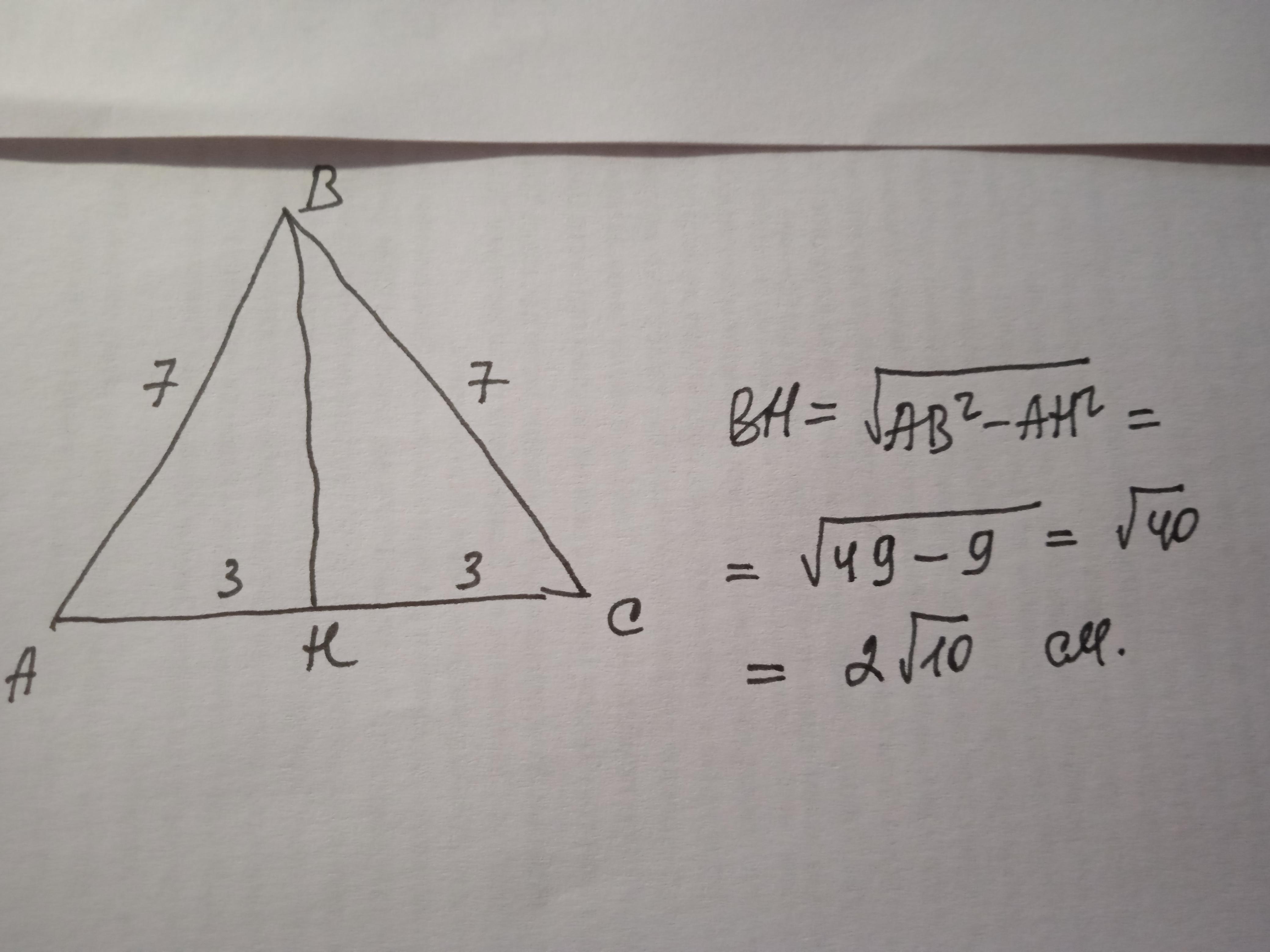 h=sqrt(7^2-6^2/4)=sqrt40=6.32