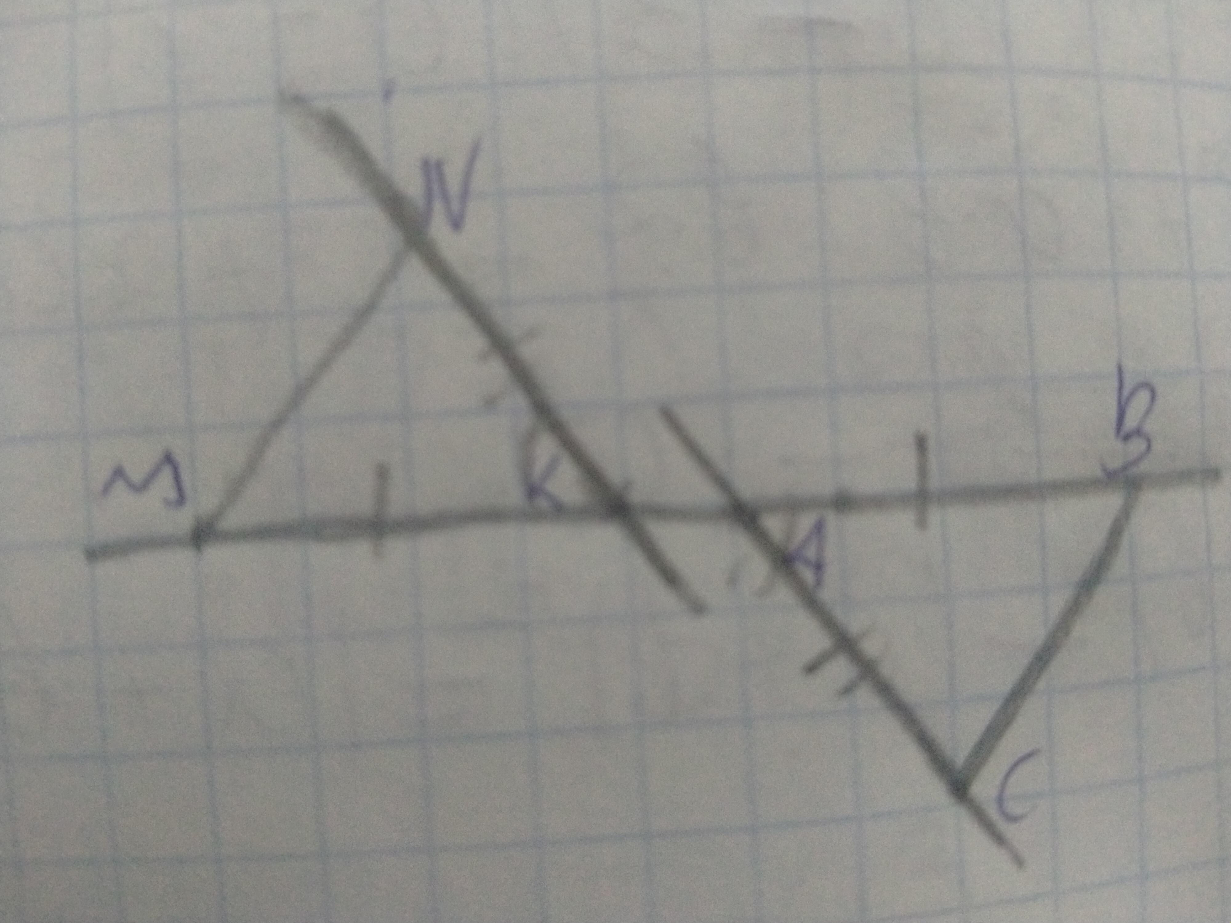2. Треугольник MKN = треугольнику ABC - по 1 признаку равенства треугольников (по двум сторонам и углу между ними)