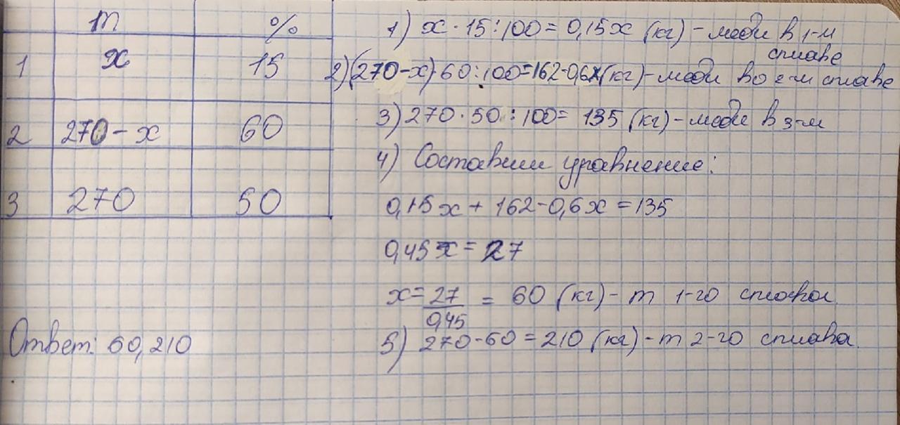 Первый сплав 15% меди второй 60%меди Сколько килограммов каждого сплава надо взять, чтобы получить 270 кг сплава, содержащего 50 % меди? Люди помогите пожалуйста!