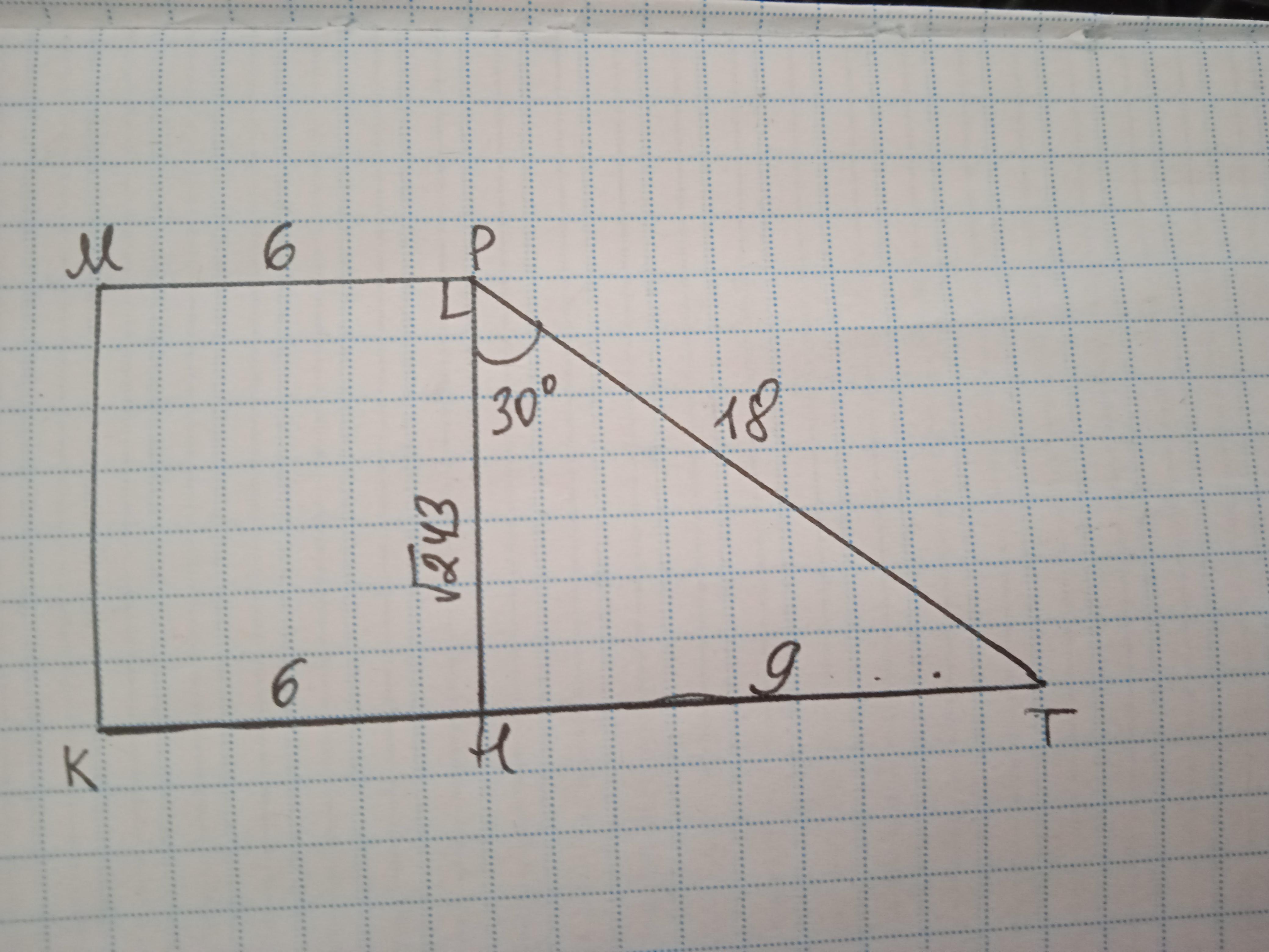 Дано: КМРТ - трапеция, МР=6 см, РТ=18 см; КМ⊥КТ, ∠МРТ=120°. Найти S(КМРТ).