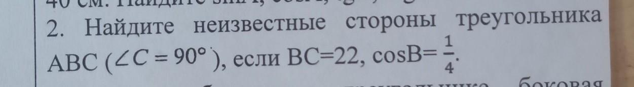 Объяснение: Для нахождения гипотенузы АВ нужно ВС разделить на cosВ и это будет равно 22 : 1/4= 88; Сторону АС найдем по теореме Пифагора: квадрат гипотенузы равен сумме квадратов катетов. Отсюда: АВ=√88²-22²=85,2.