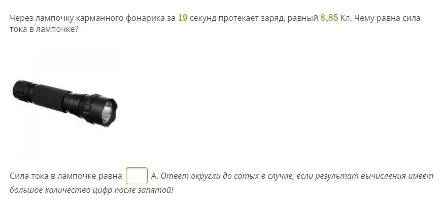 Через лампочку карманного фонарика за 19 секунд протекает заряд, равный 8,85 Кл. Чему равна сила тока в лампочке?