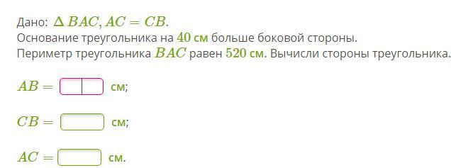 Так как две стороны равны, значит треугольник равнобедренный. Основание на 40 см больше боковой стороны, значит боковая сторона = (520 - 40) : 3 = 160 см., а основание 520 - 160 * 2 = 200 см. По условию определяем какая сторона основание, а какие - боковые