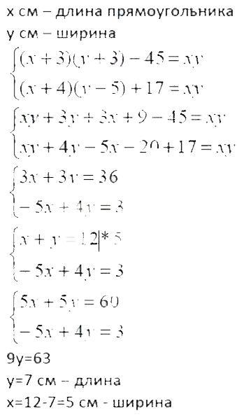 Якщо кожну сторону прямокутника збільшити на 3 см, то його площа збільшиться на 45 см². Якщо дві протилежні сторони збільшити на 4 см, а лві інші зменшити на 5 см, то його пооща зменшиться на 17 см². Знайдіть сторони даного прямокутника.