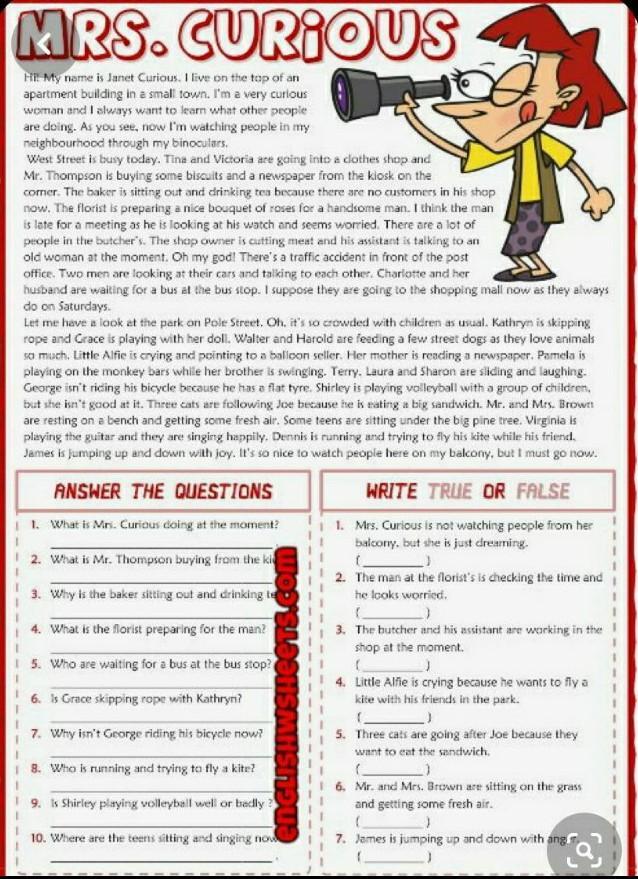 1. She is watching people in her neighbourhood through her binoculars.