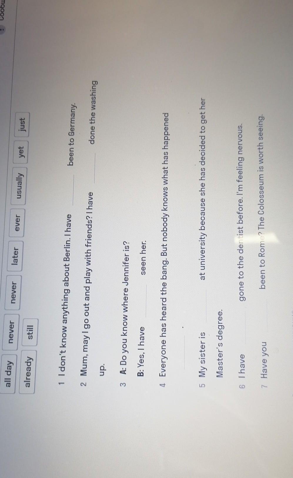 1. never; 2. already. 3. just. 4. yet. 5. still. 6. never, 7, ever.
