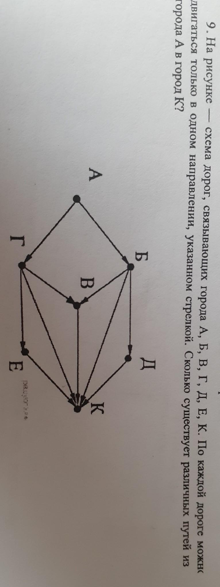 На рисунке — схема дорог, связывающих города А, Б, В, Г, Д, Е, К. По каждой дороге можно двигаться только в одном направлении, указанном стрелкой. Сколько существует различных путей из города А в город К?