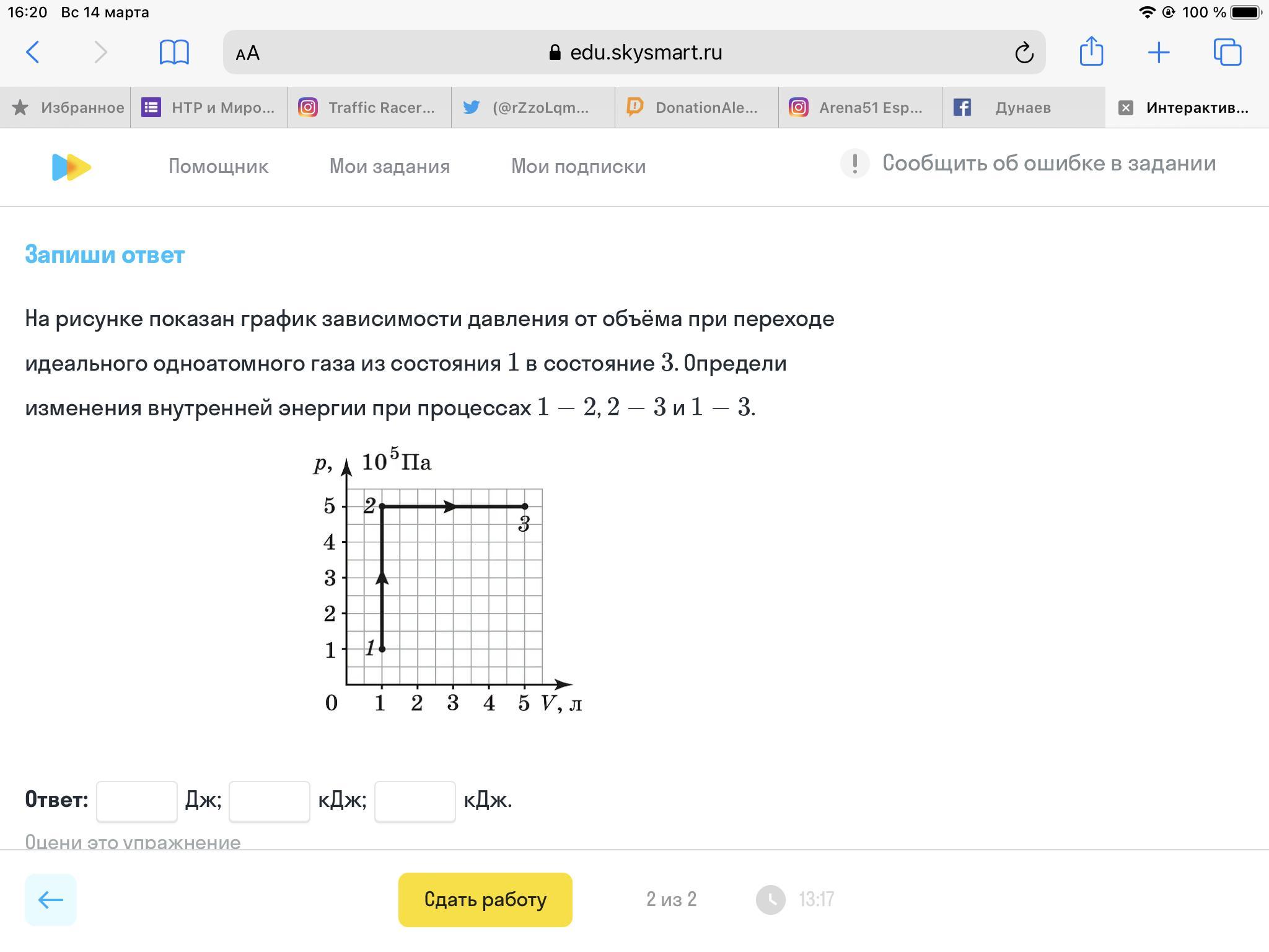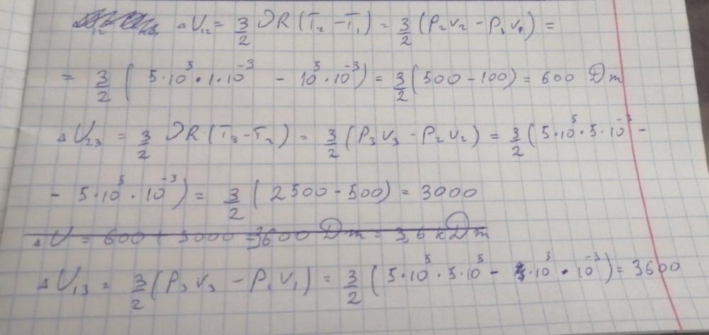 На рисунке показан график зависимости давления от объёма при переходе идеального одноатомного газа из состояния 1 в состояние 3. Определите изменения внутренней энергии при процессах 1-2, 2-3, 1-3