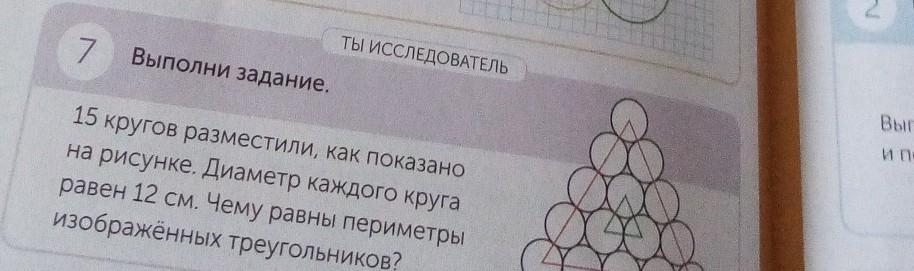 15 кругов Разместили как показано на рисунке диаметр каждого Круга равен 12 см к чему равны периметр и изображенных треугольников