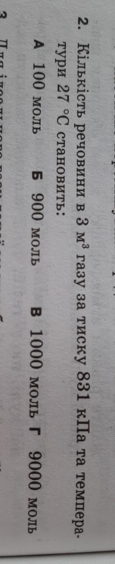 кількість речовини в 3 м³ газу за тиску 831 кПа та температури 27°С становить....