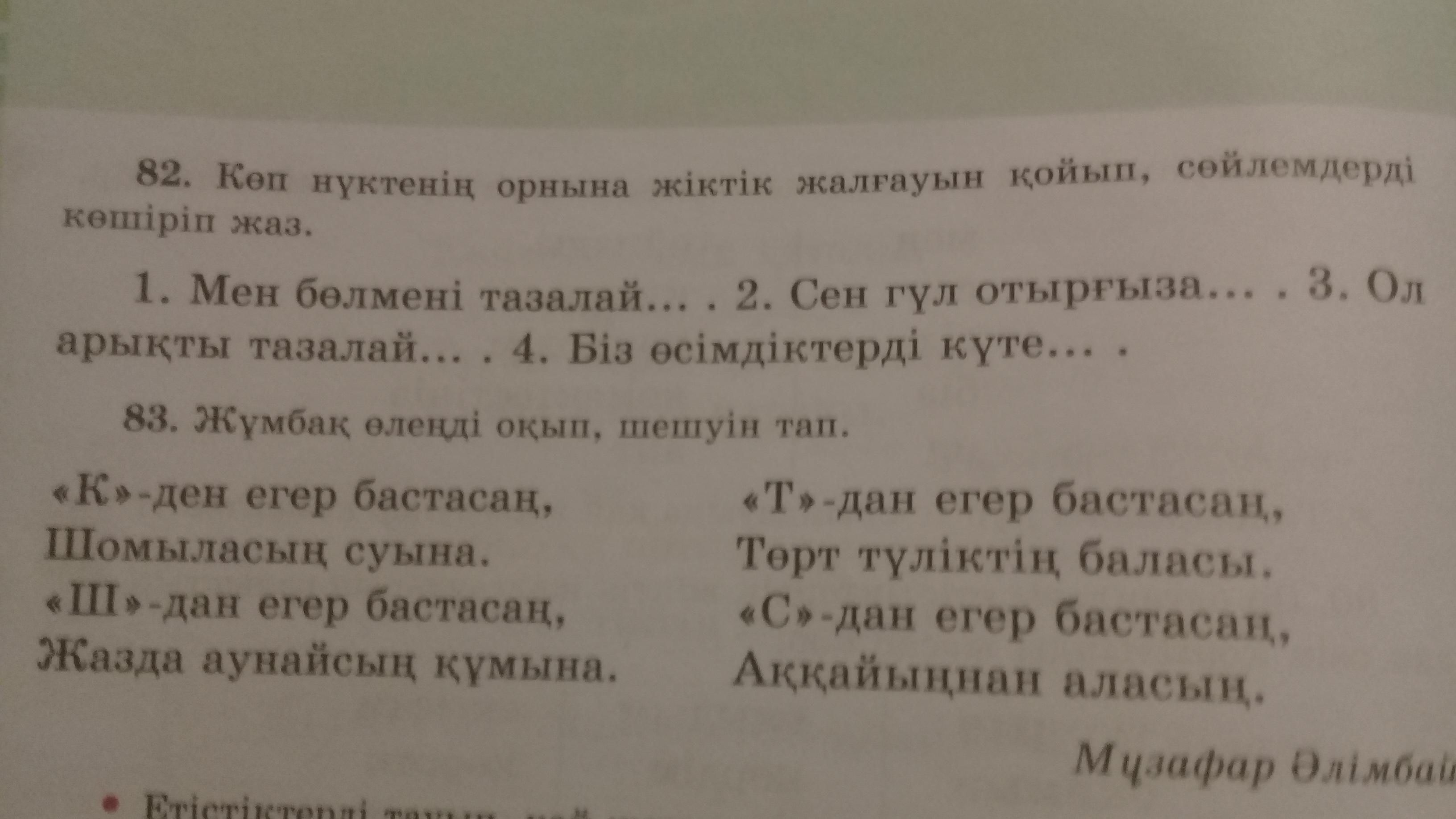 Мен бөлмені тазалаймын.сен гүл отырғызасың.ол арықты тазалайды.біз өсімдіктерді күтеміз.