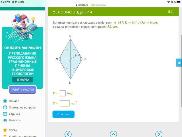 Мы используем св-во диагоналей ромба(являются бис-сами) и получаем угол ОNK 30°. Против угла в 30° лежит сторона которая равна 1/2 гипотенузы. значит NK = 12. Значит считаем периметр. Теперь по теореме Пифагора находим NO. 48²=36+ NO²
