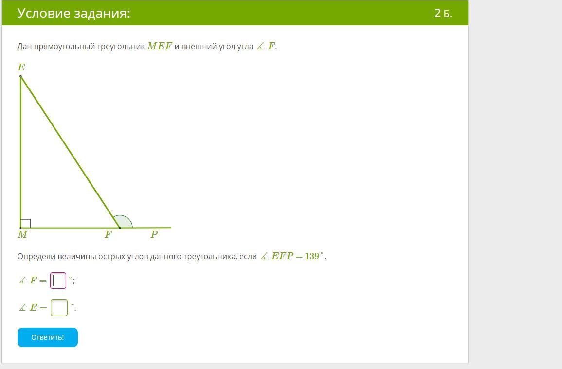 F= 41° Теорема о внешнем угле треугольника: Внешний угол треугольника равен сумме двух оставшихся углов треугольника, не смежных с этим внешним углом M равен 90