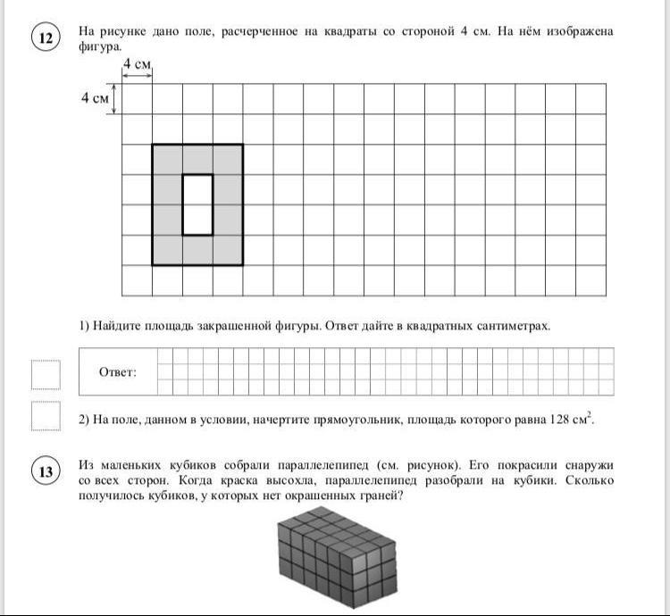 12) 4*4=16 см это площадь одного квадратика, 16*10 (столько клеточек закрашенных) = 160 см квадратных