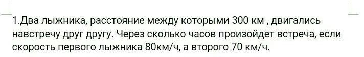 Скорость сближения (общее расстояние, на которое лыжники приближаются друг к другу в один час) равна 80 + 70 = 150 (км/ч)