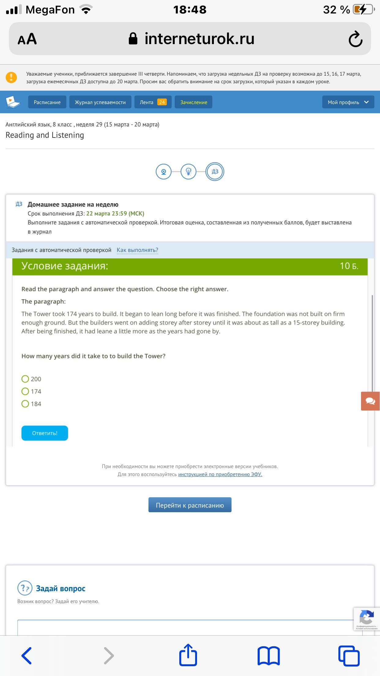 Read the paragraph and answer the question. Choose the right answer. The paragraph: The Tower took 174 years to build. It began to lean long before it was finished. The foundation was not built on firm enough ground. But the builders went on adding storey after storey until it was about as tall as a 15-storey building. After being finished, it had leane a little more as the years had gone by. How many years did it take to to build the Tower? 200 174 184