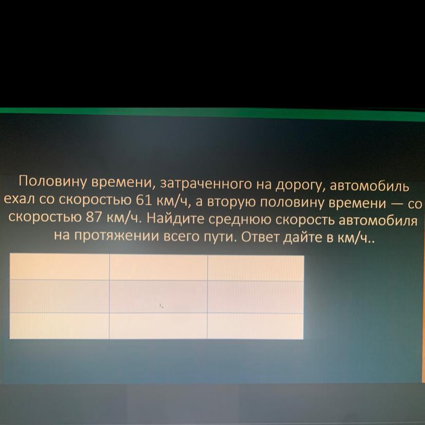 Автомобиль половину времени затраченного на дорогу проехал со скоростью 61 км/час , а вторую половину времени проехал со скоростью 87 км/час.