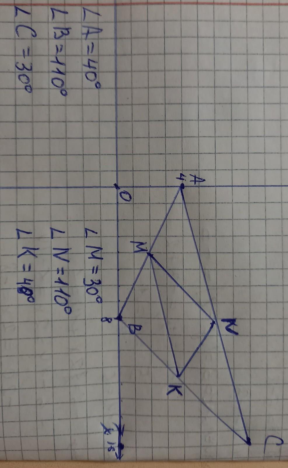 M, N и К сторон треугольника ABC, соедини их отрезками и измерь углы