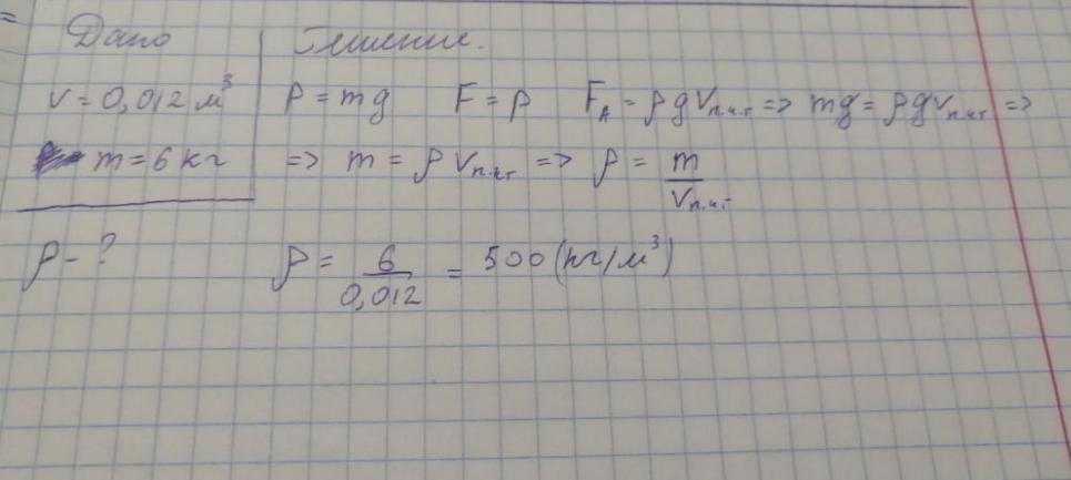 Определите плотность жидкости, в которой на тело объемом 12 дм3 действует сила равная весу пушечного ядра массой 6 кг.